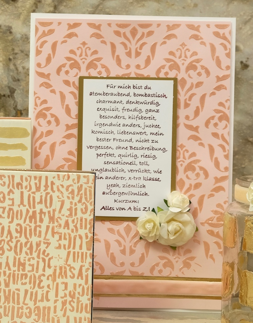 Diese Schablone eignet sich durch ihre flexible Beschaffenheit und die selbsthaftende Rückseite hervorragend zur Gestaltung von Gegenstandskörpern (z. B. Kerzen, Flaschen, Geschirr).