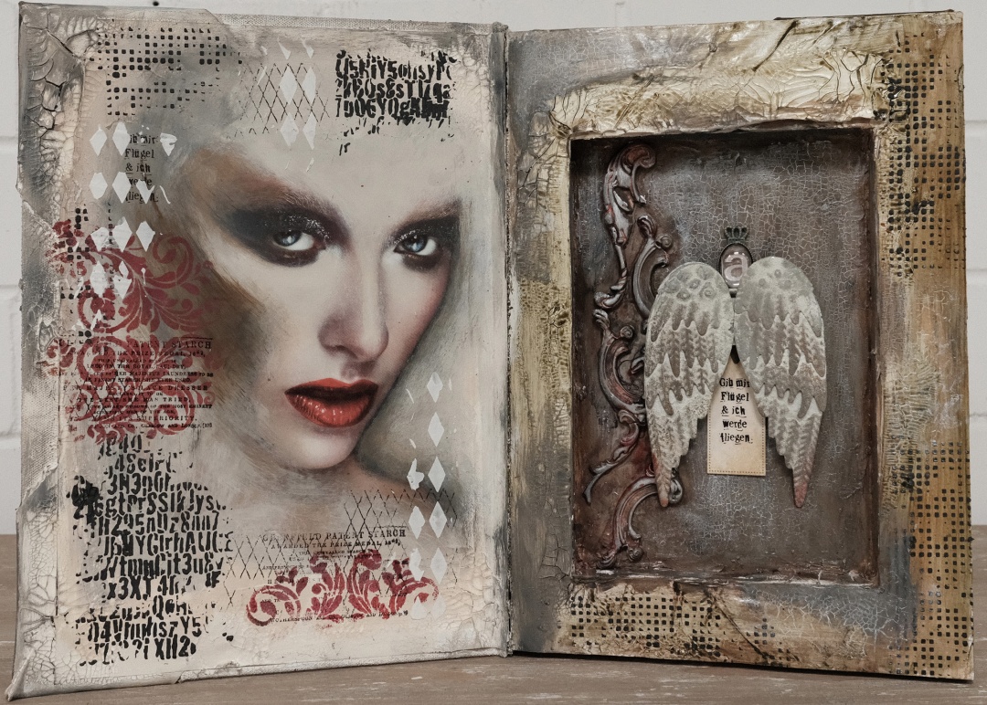 Anleitung: Ziehen Sie die Schablone vorsichtig von der Trägerfolie ab und legen Sie diese auf den von Ihnen gewählten Gegenstand. Sie haben nun die Möglichkeit, mit unterschiedlichen Medien, wie zum Beispiel Spachtelmassen, Heavy Body Gel oder Distress Ink zu arbeiten. Tragen Sie das von Ihnen ausgewählte Medium auf. Nehmen Sie die Flexi Schablone von Ihrer bearbeitenden Fläche herunter, solange das Medium noch feucht ist.